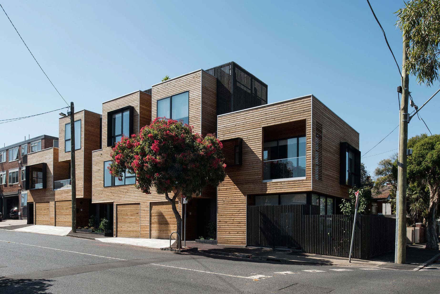 Designed by DKO architects for Milieu Property, the Andrew Street project was completed in December 2016 and involved the construction of five three-level, two and three-bedroom townhouses with roof terraces and car parking. The design included timber cladding, framed window pop outs and an articulated jigsaw façade.
