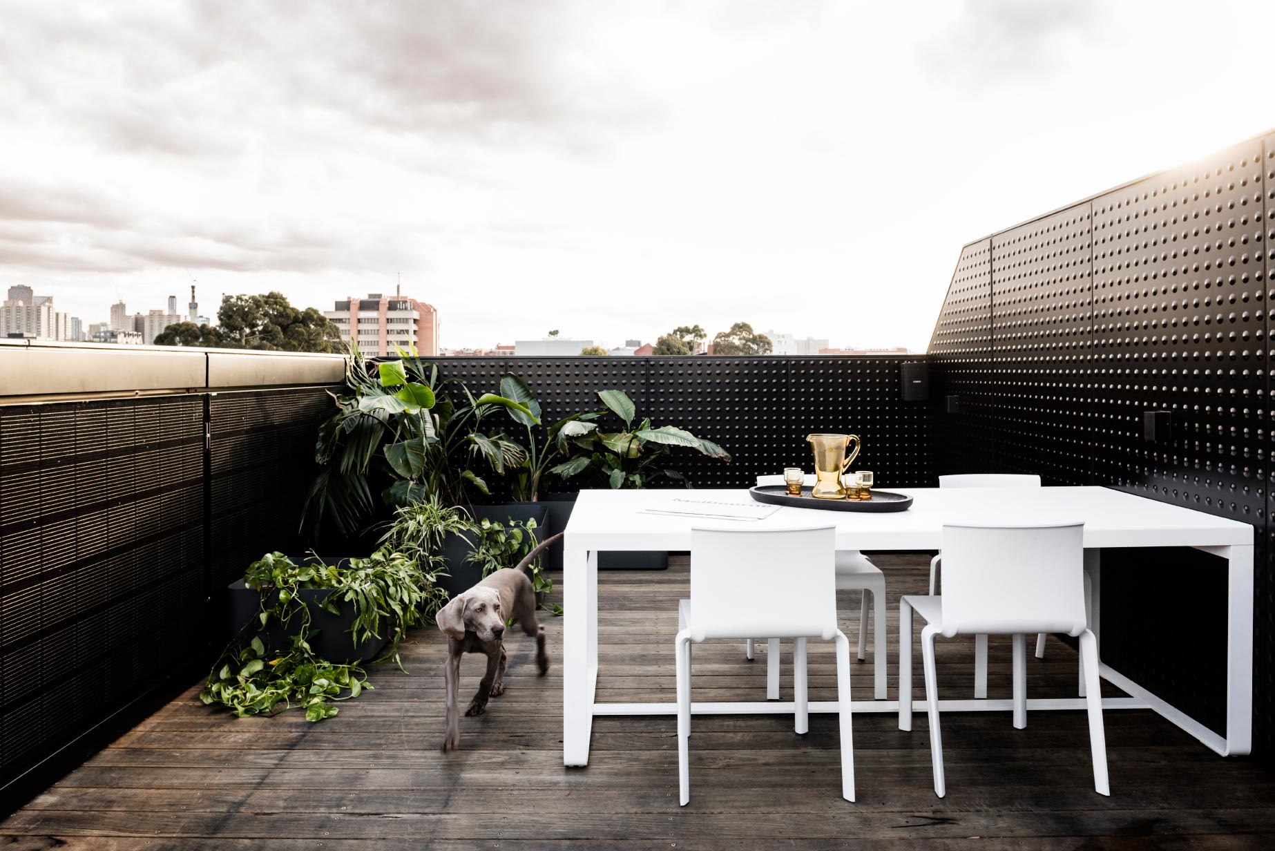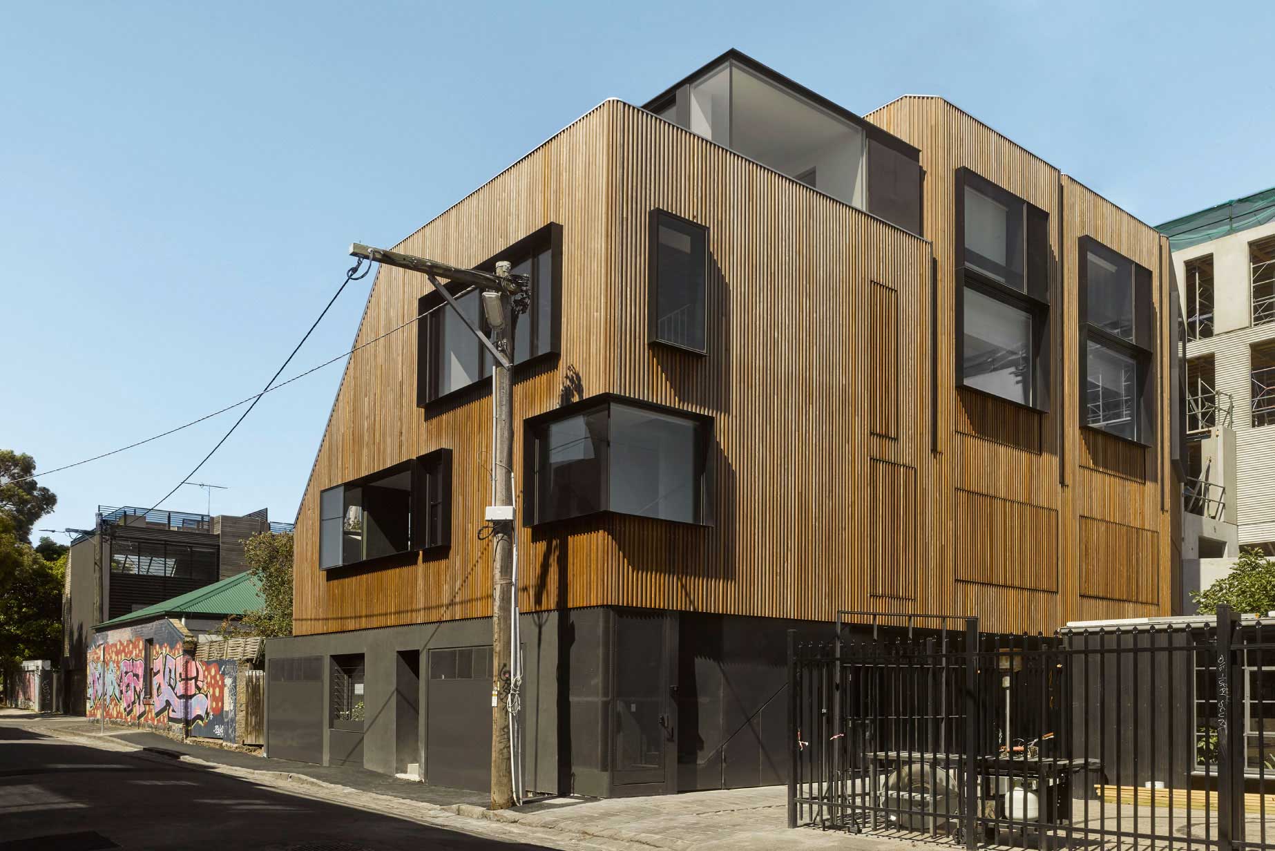Designed by DKO Architecture and SLAB Architecture, the Campbell Street project cleverly configures a 78 square-metre parcel of land in Collingwood into two light-filled, three-bedroom townhouses over four levels. As well as three bedrooms, each townhouse includes a cellar, cinema, ground-floor garage, roof-top terrace and pool deck. Campbell Street's exterior is wrapped in a perforated, powder coated, operable steel screen.